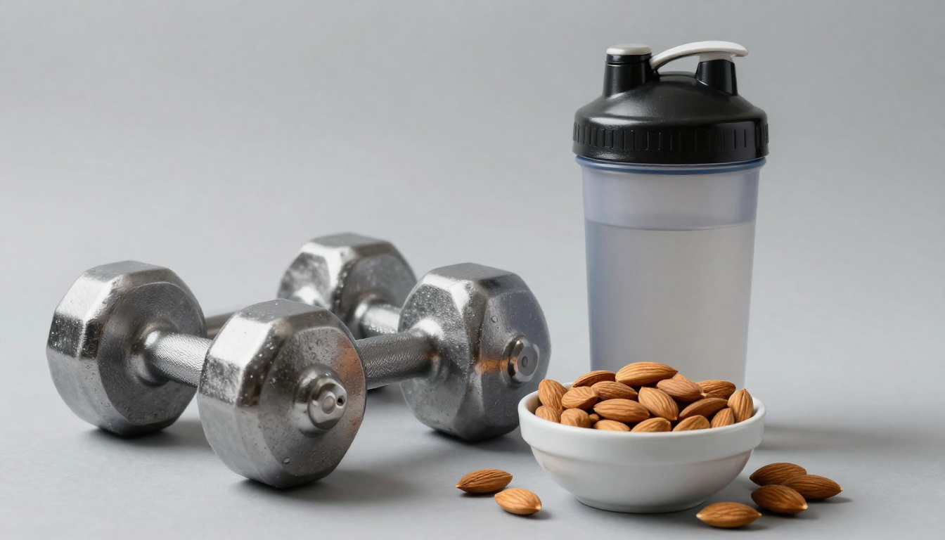 금속 덤벨 한 쌍과 단백질 쉐이커, 생아몬드가 담긴 그릇이 놓인 운동 전후 영양 섭취와 웨이트 트레이닝 이미지.