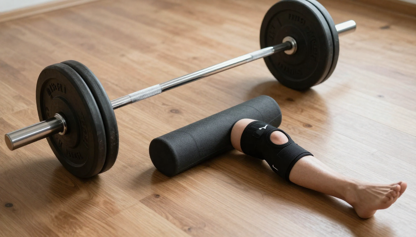 나무 바닥 위 바벨과 원판, 폼롤러와 무릎 보호대가 놓인 운동 공간의 모습입니다.